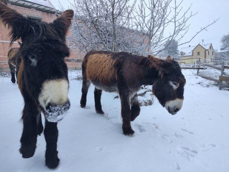 Fionns Sommerekzem ist fast völlig verschwunden. Erst im Herbst wurde er wieder kribbeliger und hatte ein paar Krusten an Bauch und Hals. Die wurden von uns wieder mit dem Mittel “MTG” eingerieben und waren fast sofort wieder glatt und heil. Gerade er wurde von uns über die warmen Monate auch sehr intensiv mit chemischer Fliegenkeule eingesprüht, das hat ihm sehr geholfen. Bei allen anderen haben das chemische und das selbst gemischte Mittel auch so gut gewirkt, dass kaum Fliegendecken notwendig wurden. Nur Masken hatten sie alle auf, weil es auch für Esel kaum etwas Unangenehmeres gibt, als ständiges Fliegengekrabbel an den Augen.